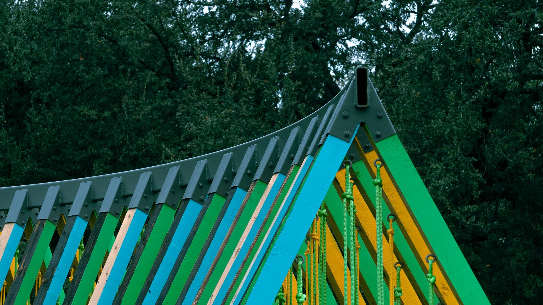 The power of transformation is further emphasized by the alternating colors inspired by local wildflowers, creating a moire effect as one walks through and around the fort structure. The outward faces of the fort’s wooden posts feature a rich Shou Sugi Ban finish, providing a direct link to the mythical phoenix. Each a-frame is punctuated with hanging rope, creating a rope maze which recalls a frolic through the tall grasses of a Blackland Prairie.
